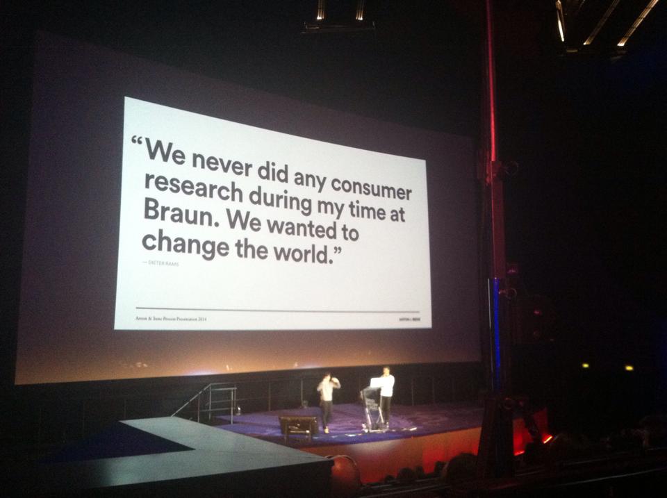 I posypały się herezje - nie używają person, uważają, że to strata czasu, koncentrują się na scenariuszach i zadaniach, nie na (wymyślonych) użytkownikach. Nie robią badań z użytkownikami, bo w nie nie wierzą - jak mówią są „design-driven, not research-driven”, a jeśli klientowi się to nie podoba, to może poszukać sobie kogoś innego (zainteresowanych tym, że są inne podejścia do tworzenia produktów, niż tylko HCD, odsyłam do książki Roberto Vergantiego "Design-Driven Innovation"). Zacytowali przy tym mistrza projektowania przemysłowego, Dietera Ramsa: