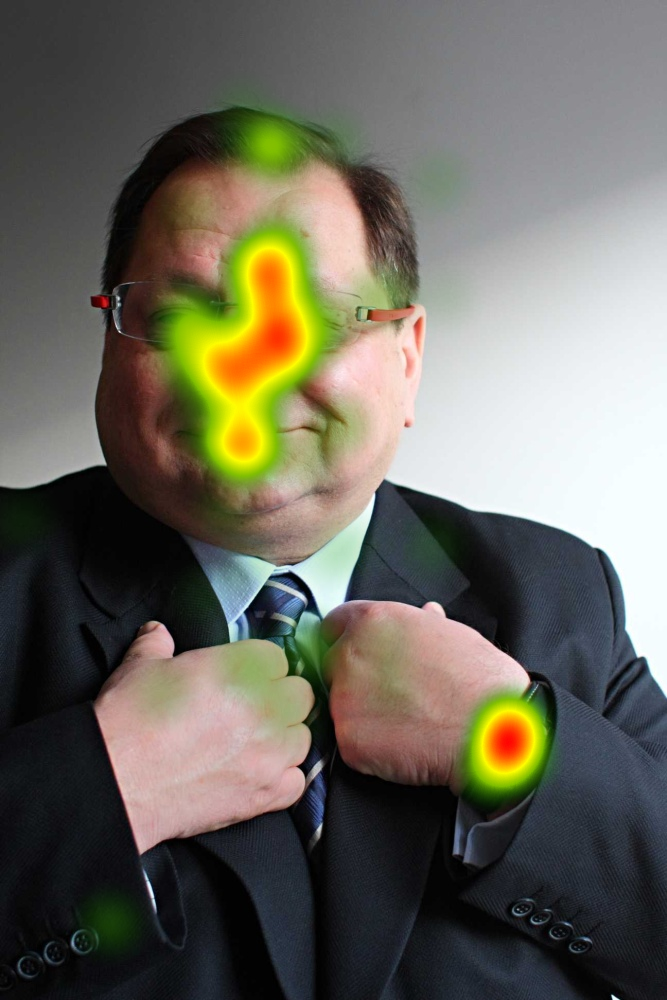 Ciekawe jest to, jak duże znaczenie mają różnego rodzaju dodatki do ubioru - zegarek (Palikot, Kalisz), krawat, obrączka albo sygnet na palcu, czy znaczek wpięty w klapie marynarki (Pawlak, Macierewicz). Szczególnie dobrze widać to, kiedy przedstawimy wyniki z eyetrackera w postaci tzw. "gaze opacity", czyli z wyciemnieniem wszystkich miejsc, na które respondenci nie patrzyli.