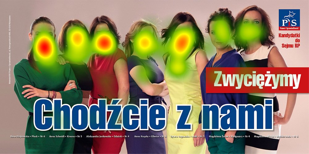 Jak widać praktycznie nikt nie interesował się tym, co na plakacie jest napisane. Wzrok męskiej części respondentów przyciągnął dekolt pani w żółtej sukience. Poza tym osoby badane przyglądały się głównie twarzom kandydatek, przy czym im bliżej logotypu PiS tym mniej fiksacji 😉 Na samo logo nie spojrzał nikt.